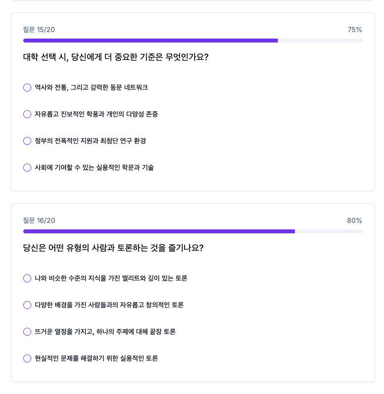 - 이상적인 캠퍼스 라이프: 동아리 활동, 축제, 교환학생 프로그램 등 어떤 경험에 더 가치를 두는지 알아보며 여러분이 꿈꾸는 대학 생활을 그려볼 수 있도록 도와줍니다.