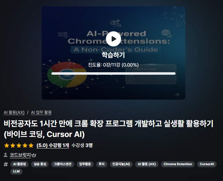 네, 가능합니다. 이 강의는 단순히 크롬 확장 프로그램의 문법을 나열하지 않습니다. 가장 핵심적인 기능에 집중하여, 딱 1시간 만에 실제로 작동하는 결과물을 만드는 것을 목표로 합니다.