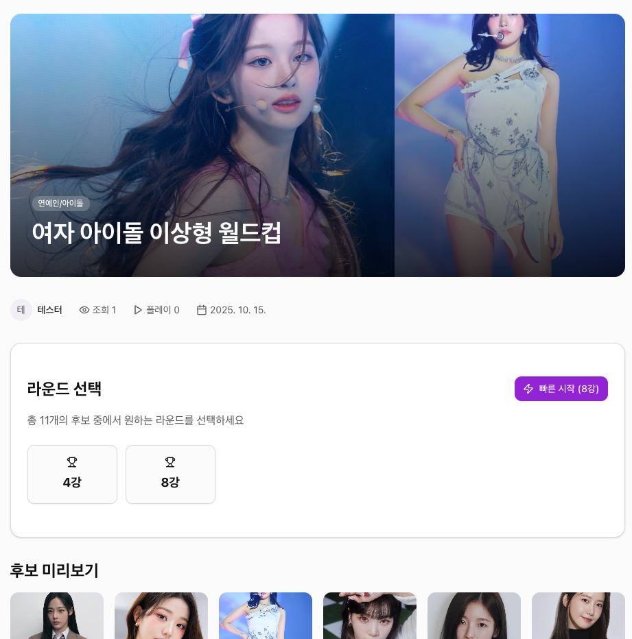 지금 바로 '여자 아이돌 이상형 월드컵'에 참여하고, 수많은 매력적인 후보들을 뚫고 당신의 마음을 사로잡을 단 한 명의 아이돌을 뽑아보세요! 당신의 선택이 K-POP 아이돌 이상형의 새로운 기준이 됩니다!