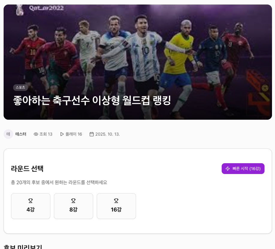 지금 바로 '좋아하는 축구선수 이상형 월드컵'에 참여하고, 수많은 매력적인 후보들을 뚫고 당신의 마음을 사로잡을 단 한 명의 축구 스타를 뽑아보세요! 당신의 선택이 축구 팬덤 내 이상형의 새로운 기준이 됩니다!