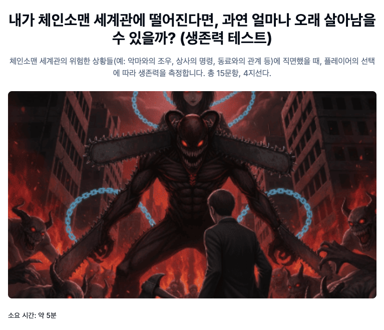 이 테스트를 통해 여러분은 자신이 체인소맨 세계에서 어떤 유형의 생존 전략을 가지고 있는지, 그리고 어떤 캐릭터와 가장 유사한 생존 궤적을 그릴지 객관적으로 진단할 수 있습니다.