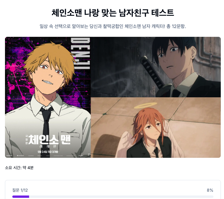 지금 바로 테스트에 참여하고, 당신의 마음을 훔치고 당신의 인생을 함께할 단 한 명의 체인소맨 남자친구를 찾아보세요! 당신의 테스트 결과가 어쩌면 당신의 실제 이상형을 깨닫게 해줄지도 모릅니다!