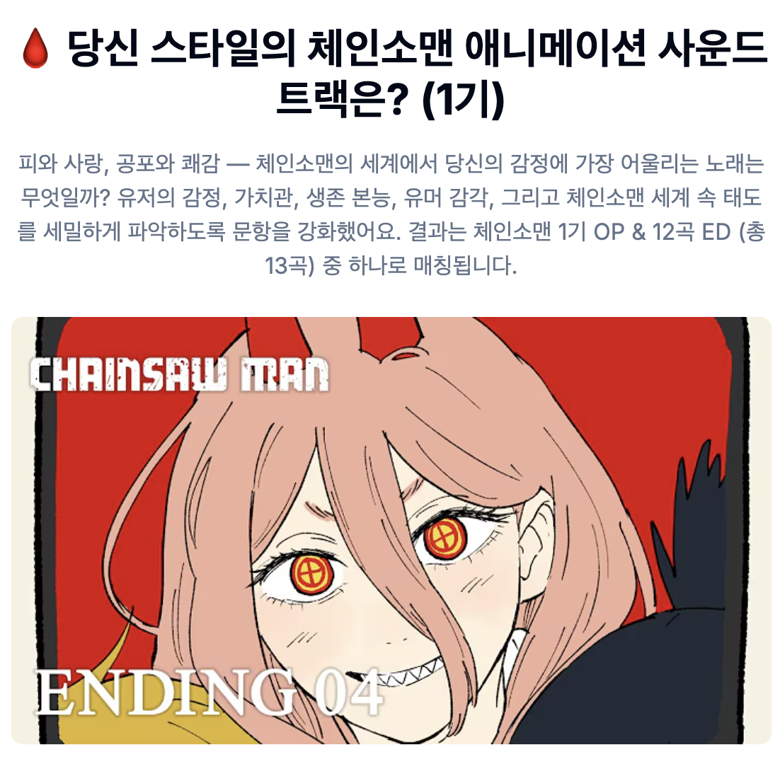 결과를 SNS에 공유하고, 친구들의 '인생 OST'가 무엇인지 함께 확인하며 누가 가장 체인소맨 세계관에 최적화된 감성을 가졌는지 겨뤄보세요!