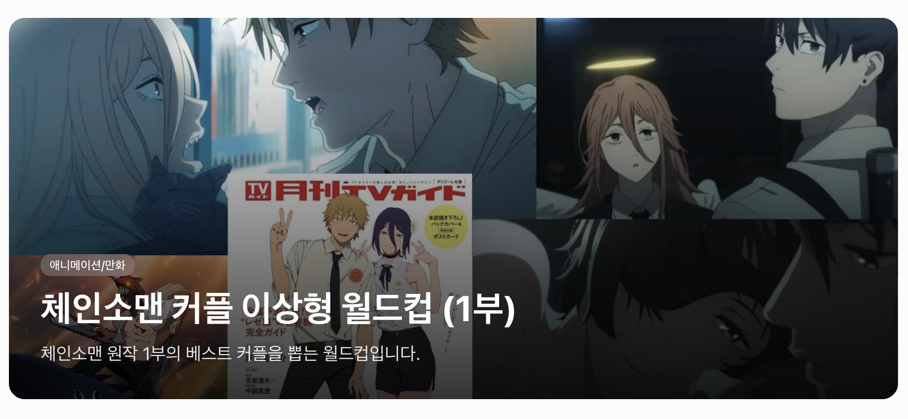 지금 바로 **'체인소맨 커플 이상형 월드컵'**에 참여하고, 체인소맨 세계관에서 당신의 마음이 가장 강력하게 반응하는 최종 커플 조합을 뽑아보세요! 당신의 선택이 어쩌면 당신의 다음 연애에 대한 강력한 힌트가 될지도 모릅니다!