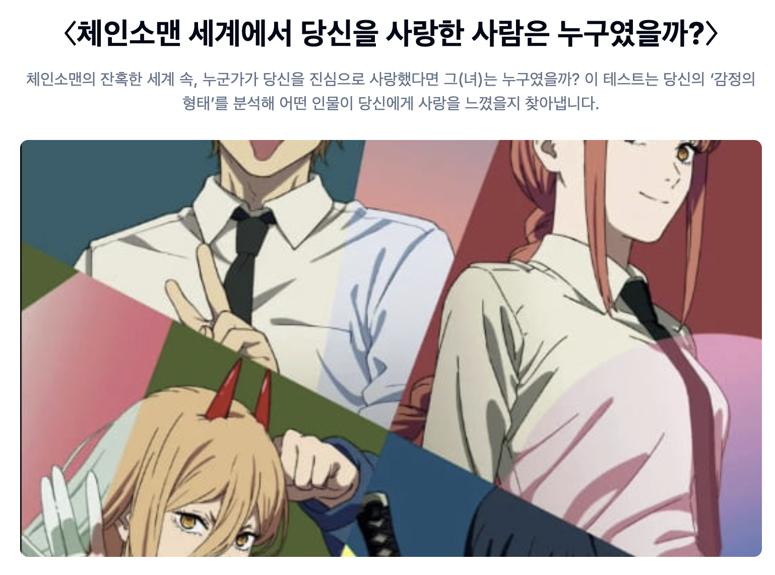 "당신을 향한 체인소맨 캐릭터의 사랑은 어떤 형태일까?"