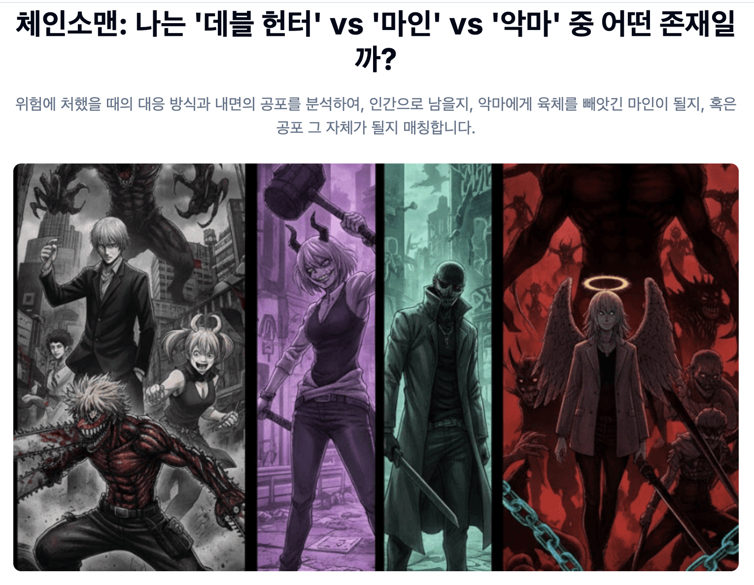 지금 바로 **'체인소맨 존재 유형 테스트'**에 참여하고, 당신의 잠재된 성향이 체인소맨 세계 속 세 가지 존재 중 어떤 것에 가장 가까운지 확인하세요! 이 결과는 당신의 '공포의 근원'과 '생존 방식'을 명확히 보여줄 것입니다.