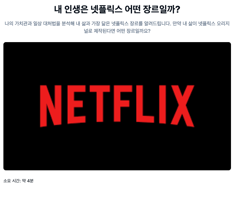 여러분의 인생은 과연 어떤 장르의 넷플릭스 오리지널일까요? 지금 바로 아래 링크에서 내 인생 장르를 확인해 보고, 오늘 밤엔 추천받은 작품을 정주행해 보세요!